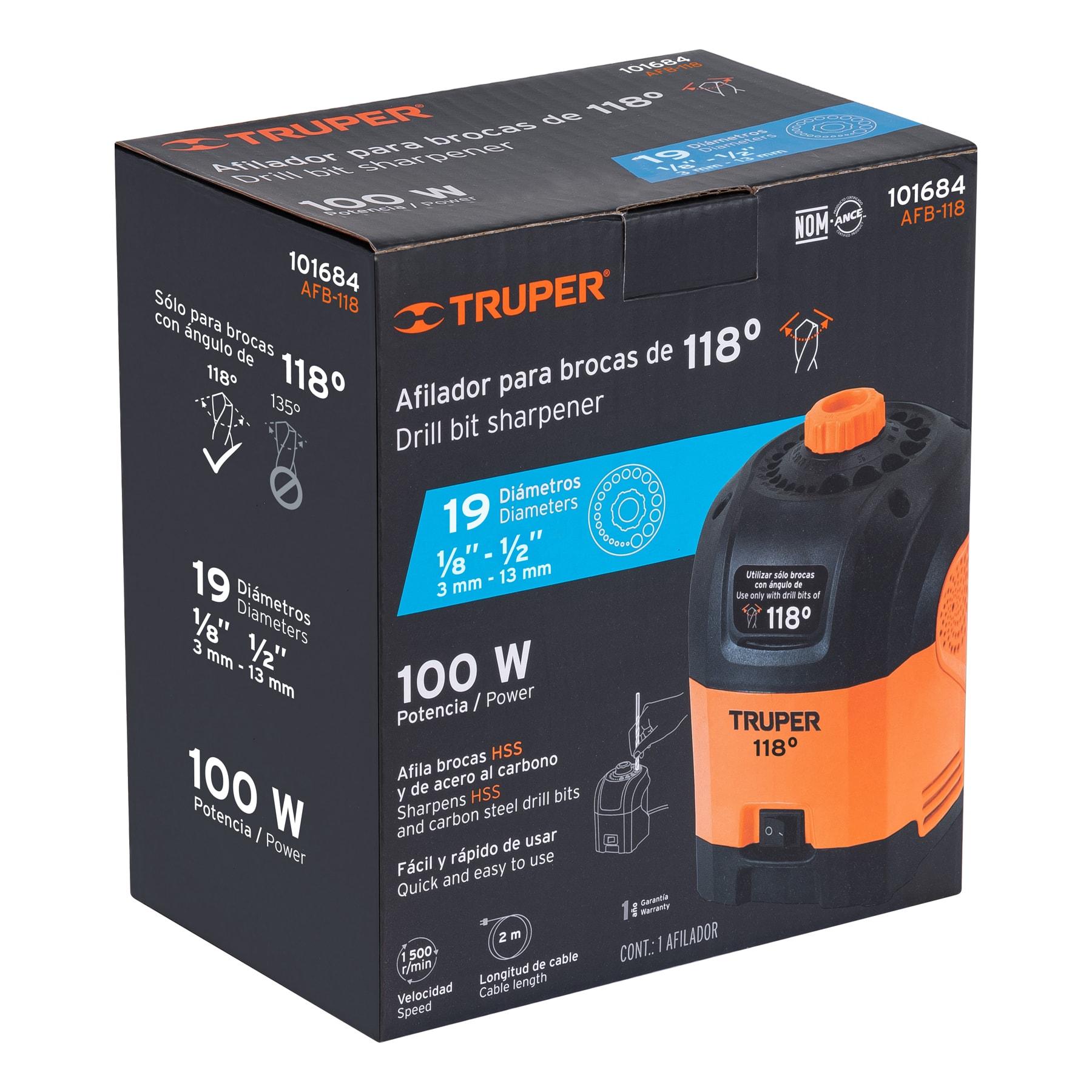 | Diámetros de afilado para brocas con punta 118° | 1/8", 9/64", 5/32", 11/64", 3/16", 13/64", 7/32", 15/64", 1/4", 17/64", 9/32", 19/64", 5/16", 21/64", 11/32", 23/64", 3/8", 7/16" y 1/2" |